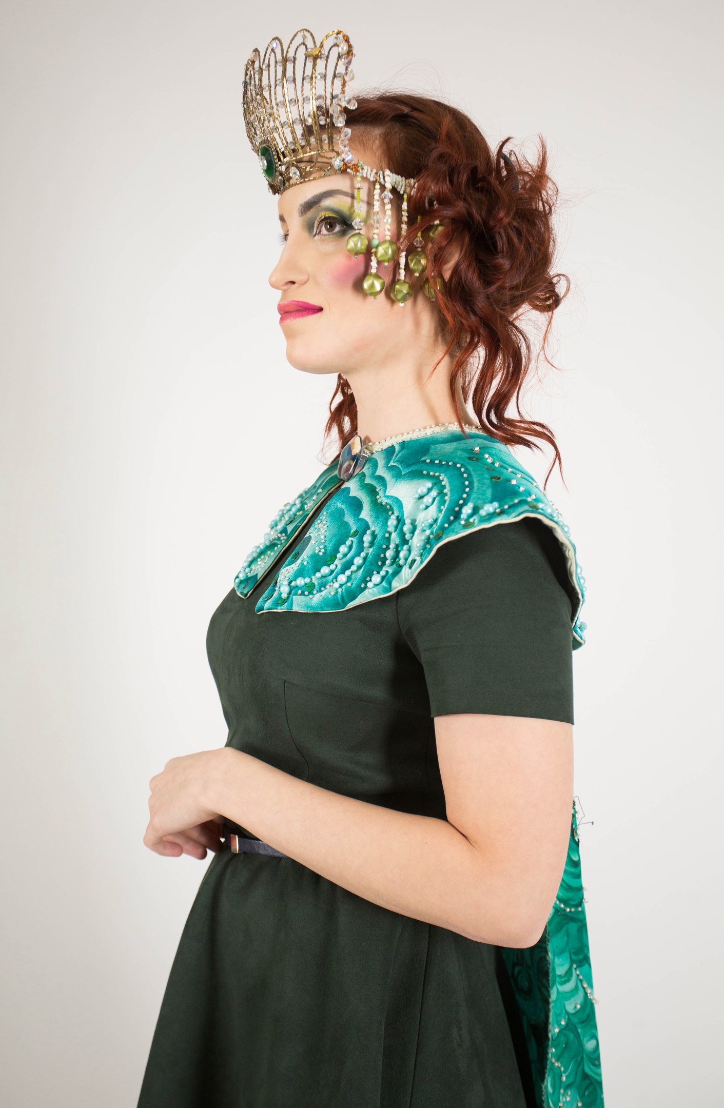 Открытая корона из золотистого металлического каркаса с бусинами, стразами и подвесками
